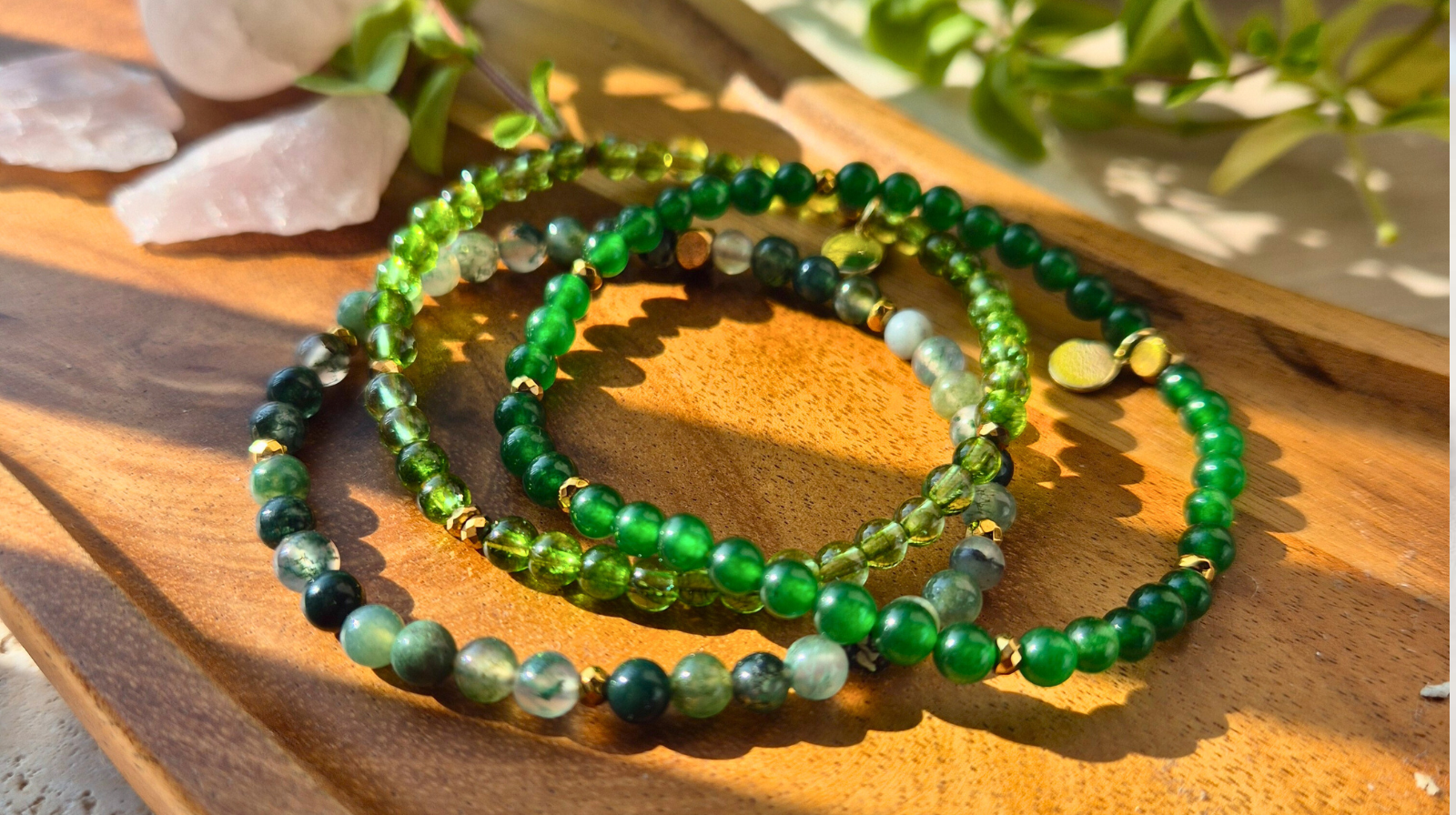 Håndlagde krystallarmbånd i naturens farger – skapt for ro, energi og nærvær i hverdagen.